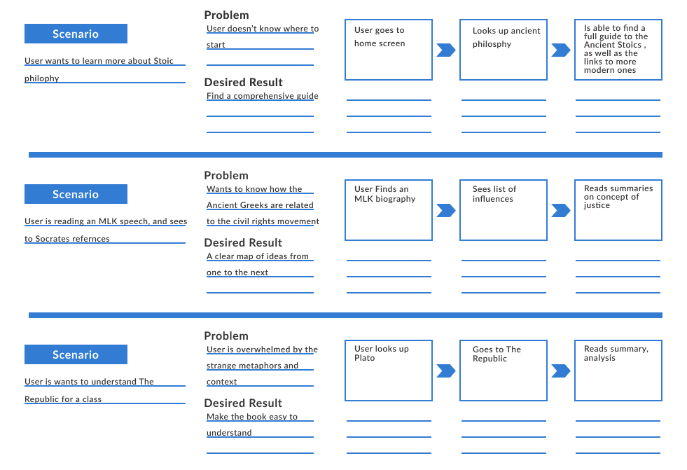The scenario goes hand in hand with the user journey. This allows me to map out any problems or scenarios that the user may come across when using the app and the suggested solutions to those problems. This is really important as I can take these scenarios and shape the wireframes around them. It’s always a good idea to think of these things before thinking about any app design or functionality.