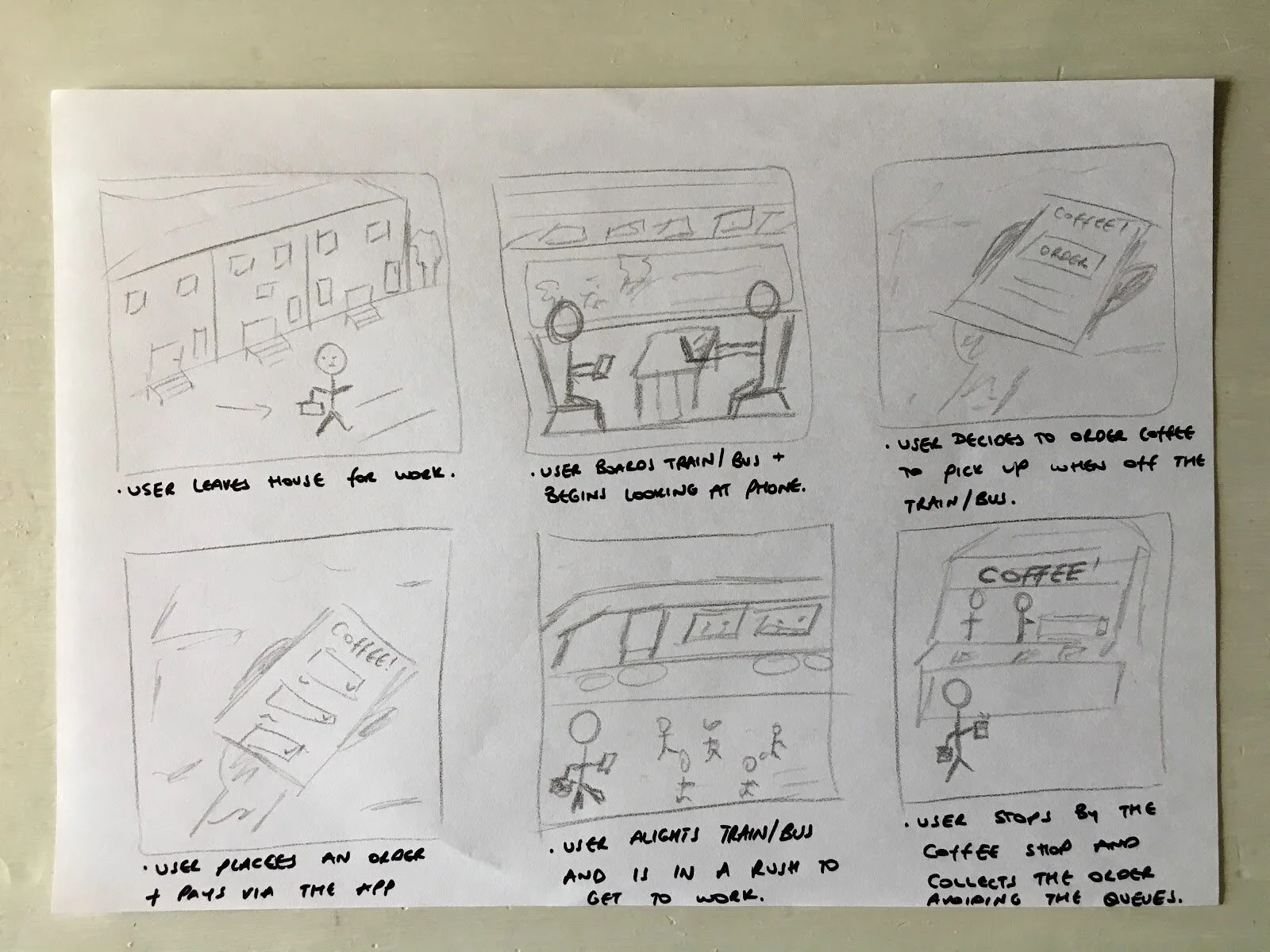 My next task is to storyboard, making sure that I focus on the users actions and environment. Here’s the storyboard I came up with
