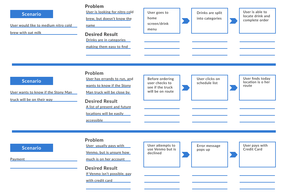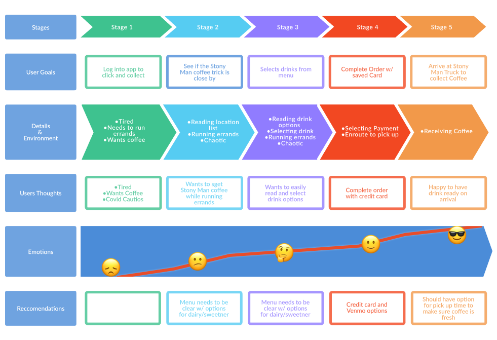 Next I need to work out the business and user goals. To help me with this, I use observational research by observing people as they order a coffee on an app. I was able to work the truck with Brooks, asking customers what they would like to see in an app, and getting a first hand view of the Brooks’ work process.